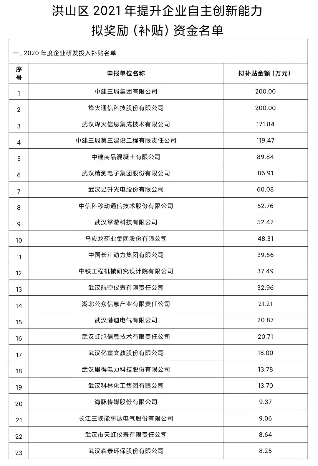 附件:洪山区2021年提升企业自主创新能力拟奖励(补贴)资金名单